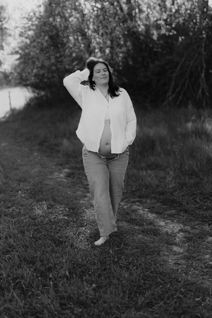 Vi började med enkla och naturliga poseringar i bekväma kläder. Klänningar på sommaren brukar vara något många föredrar men denna gång bytte Athena om till ett par bekväma blåa jeans, en bh och en vit skjorta. Både jeans och skjorta hölls uppknäppt för att framhäva gravidmagen på ett vackert sätt.