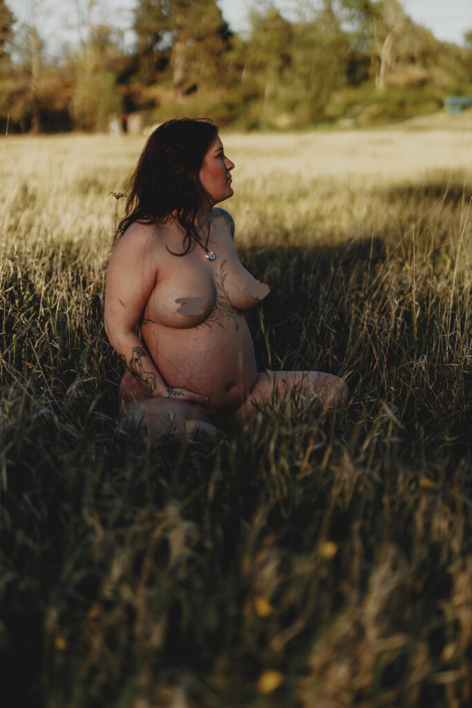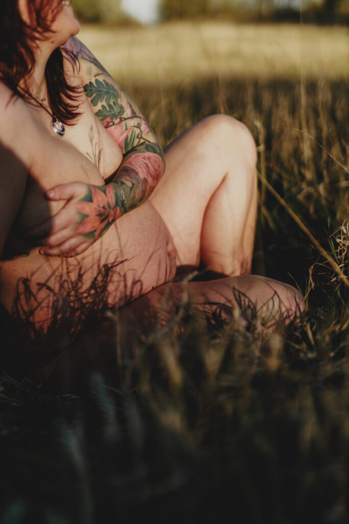 Vi visste att den största delen av tiden skulle läggas på de mer hudnära gravidbilderna i gräset, innan solen hann sjunka för lågt. Ljuset förändras snabbt på kvällen, och vi ville fånga värmen och mjukheten som uppstår precis innan det börjar bli svalt. När Athena klev ur sina kläder och satte ner fötterna i gräset var det som att hela situationen blev ännu mer avskalad. Det finns alltid ett ögonblick av mod i det där att stå naken ute i naturen med kameran riktad mot sig. Men baserat på flera fina recensioner så vill jag lova dig att det är när man tar sig igenom den första sekunden så hamnar man i en känsla av frihet istället för att känna sig obekväm.
